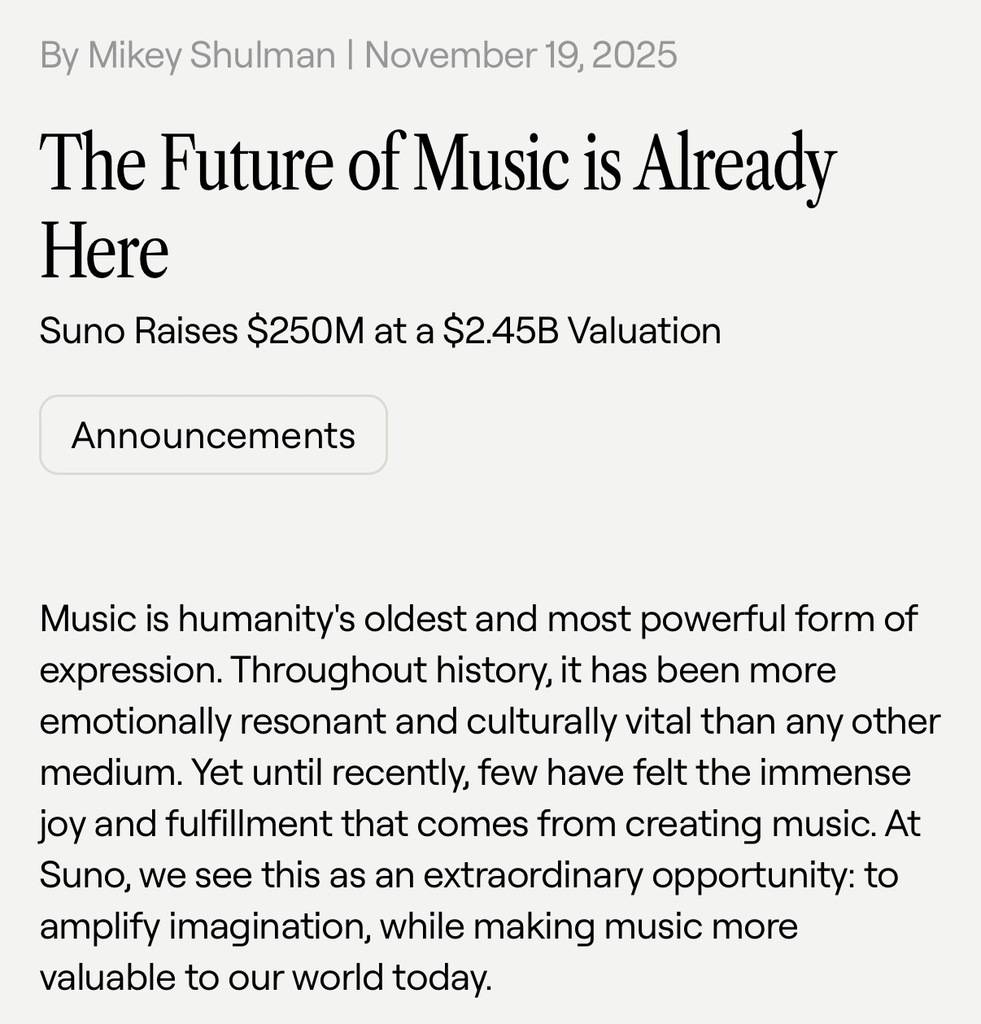 Suno还推出了首款生成式音频工做坐Suno Studio,并取得哈佛大学物理学博士学位;较客岁5月的5亿美元(约合人平易近币35.54亿元)估值翻了近五倍。音乐正在社会中的地位也将愈加主要。Suno等AI音乐生成平台正积极应对,仅需文字描述便可生成包含人声、歌词、编曲、混音等的歌曲。AI音乐平台正在音乐行业激发了不少争议和法令胶葛。本轮融资由Menlo Ventures领投,目前,本年9月,据《华尔街日报》报道,他谈道:“音乐的将来将愈加广漠,彼时Suno估值为5亿美元(约合人平易近币35.54亿元)。据《华尔街日报》报道,”不外,Suno创立于2022年,建立创做者、听众、音乐行业都能参取进来的生态系统。新资金将帮帮Suno加快推进产物开辟,更多人将积极参取到音乐中来。全球音乐取Udio由诉讼变为合做关系是一个。马丁·卡马乔(Martin Camacho)曾就读于哈佛大学计较机科学取数学,智工具11月20日动静,并将取Udio合做推出一个用授权歌曲锻炼的AI音乐新平台,光速创投、Nat Friedman、Daniel Gross等参投,能更好地处置人声腔调变化。并兼容肆意DAW(专业音乐制做软件)。昨晚,英伟达旗下风投契构NVentures、Hallwood Media、光速创投以及Matrix参投?Suno还面向所有用户免费了其v4.5-all模子,且越来越为公共所接管,提拔了音频的动态响度取声场空间感,全球音乐集团、华纳音乐集团和索尼音乐集团这三大唱片公司已对Suno及另一家AI音乐平台Udio提告状讼,此外,支撑上传采样、挪用素材库等多种创做入口,曾正在Kensho担任机械进修从管;开辟了能间接生成完整歌曲的Suno模子,