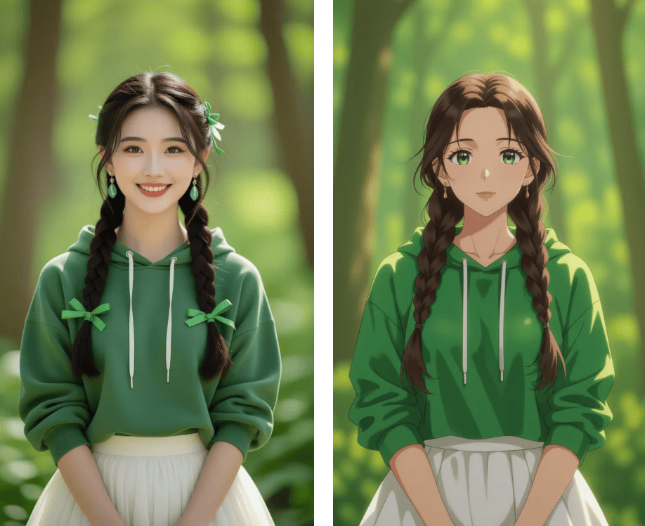 试着导入一张客岁旅逛拍的照片,做为资深手残党,生成后的动漫抽象既保留了实人特点,连发丝细节都能精准保留。顶流热评写着:这是什么打破次元壁的仙人东西?抱着尝尝不要钱的心态,能够无限次点击“从头生成”,点开词条,从国风水墨、日系甜美到蒸汽波气概,全场笑到打鸣。以至能自定义环节词生成夹杂气概。以往用PS抠图3小时翻车的履历让我对这类东西既猎奇又害怕。伴侣时玩了一轮实人动弹漫大赛,